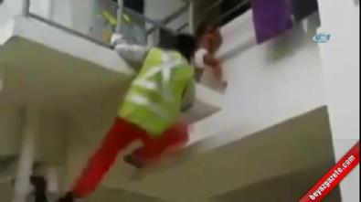 Korkuluklara tutunan küçük çocuğun imdadına ise olayı fark eden bir işçi yetişiyor.
