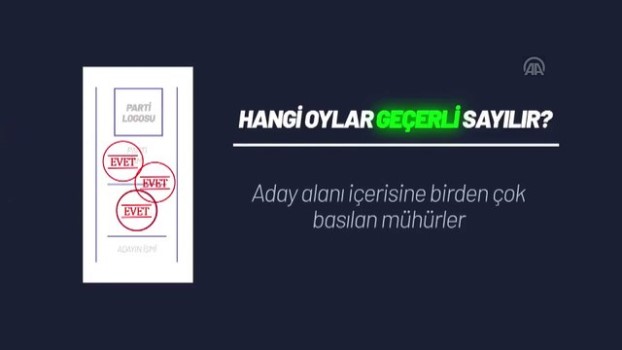 Videoda, oy verme işlemi esnasında tercih edilen aday alanına basılan, aday alanı içerisine birden çok basılan ve alanları ayıran çizgili bölgeyi taşsa da diğer adayın alanına taşmayan mühürlerin geçerli sayılacağı bilgisi verildi.