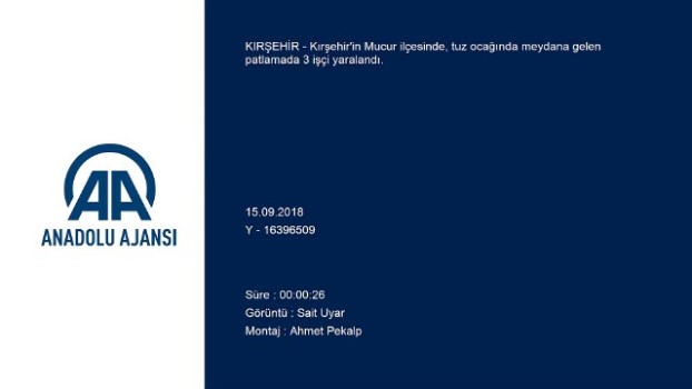 - Patlama yaşanan olay yerinden görüntüler - Kırşehir 'de tuz ocağında patlama: 3 yaralı - Kırşehir Valisi İbrahim Akın: - "Tepesidelik köyündeki tuz madeninde işçiler tuz çıkarmak amacıyla işveren tarafından temin edilen malzemelerle patlayıcı madde yapmaya çalıştıkları esnada patlama meydana geliyor"KIRŞEHİR (AA) - Kırşehir 'in Mucur ilçesinde, tuz ocağında meydana gelen patlamada 3 işçi yaralandı.Tepesidelik köyündeki özel bir şirkete ait tuz ocağında, hazırlanan patlayıcı madde henüz belirlenemeyen nedenle infilak etti.Patlamada işçiler Cihan Cihat (33) ile Afganistan uyruklu Nurullah Sahel (23) ve Halim Jander yaralandı.Yaralılar, Ahi Evran Üniversitesi Eğitim ve Araştırma Hastanesine kaldırıldı. Kırşehir Valisi İbrahim Akın, AA muhabirine, işçilerin işveren tarafından temin edilen malzemelerle patlayıcı madde yapmaya çalıştıkları esnada patlamanın meydana geldiğini söyledi.