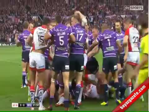 İngiltere'de dün Rugby Süper Lig'in büyük final maçında karşı karşıya gelen St Helens ve Wigan Warriors takımları arasında kavga çıktı. Wigan Warriors'un oyuncusu Ben Flower rakip takımın oyuncusu Lance Hohaia'yı yumrukladı.