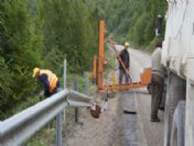 Karayolları 152. Şube Şefliği, Küre-İnebolu arasındaki yol çalışmaları sırasında bozulan bariyerleri yeniliyor.