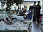 GERMANY TRAFFICEPA02121338 PASSENGERS REST ON MAKESHİFT BEDS AT THE AİRPORT İN MUNİCH, GERMANY, 17 APRİL 2010. VOLCANİC ASHES FROM AN ERUPTİON ON ICEL