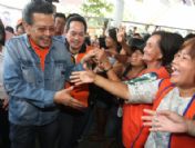 epa02123641 Former Philippine president Joseph ' Erap ' Estrada ( L ) greets supporters as he celebrates his 73rd birthday in Payatas district of Quezon City , east of Manila , Philippines 19 April 2010 . Estrada , ousted in 2001convicted of large-scale corruption in 2007 , returns to the elections campaign trail as he runs again for president in the upcoming 10 May national elections . EPA/ROLEX DELA PENA