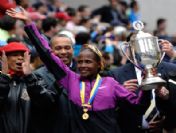 USA BOSTON MARATHONEPA02124225 TEYBA ERKESSO OF ETHİOPİA CROSSES THE FİNİSH LİNE TO WİN THE WOMEN'S DİVİSİON OF THE 114TH BOSTON MARATHON AS TATYANA