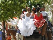 epa02125431 A group of women dressed'flamencas' dance during the April Fair of Seville, Andalusia, southern Spain, 20 April 2010. Yesterday at midnight started the 163rd edition of this festivity after the famous 'prueba del alumbrao' (the door that opens the fair lights 370 thousand bulbsthe party begins). Around a million people couldduring rush hours. EPA/EDUARDO ABAD