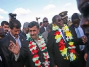 epa02127956 Iranian President Mahmoud Ahmadinejad (L)Zimbabwean President Robert Mugabe (R) greet each other at the Harare International airport, Zimbabwe, Zimbabwe, 22 April 2010. President Ahmedinejad is in the country on a two-day state visitis expected to officially open the 51st trade fair exhibition 23 April. EPA/AARON UFUMELI