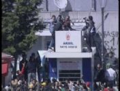 1 Mayıs kutlamalarının yapıldığı Taksim Meydanı'nda akbil satış gişesinin üstüne çıkarak eliyle bir partinin işaretini yapan bir genç, öfkeli kalabalık tarafından linç edilmek istendi