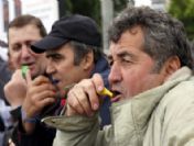 epa02161067 Romanian workers, members of the tradeconfederation whistleshout anti-government slogans during a protest in front of the government headquarters in Bucharest, Romania, 17 May 2010. Trade Union members were picketing for the fourth consecutive working day the governmentpresidency headquarters. Romanian unions threatened a wave of strikes in protest against salarypension cuts after President Traian Basescu announced the cutting expenses last week, saying they were needed to ensure continuation of a 20 billion euro aid package led by the International Monetary Fund (IMF), in order to prevent higher taxesa run on the Romanian currency. EPA/ROBERT GHEMENT