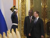 epa02166097 Russian President Dmitry Medvedev (R)Namibian President Hifikepunye Pohamba (2-R) greet Namibian diplomats before their talks in Moscow's Kremlin, Russia, 20 May 2010. 'Russia is returning on the African continent as its close partner after a break due to our internal difficulties' Medvedev said at the talks with Namibian President Hifikepynye Lucas Pohamba on 20 May. EPA/ALEXANDER ZEMLIANICHENKO/POOL