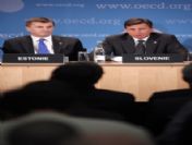 epa02175986 Italian Prime Minister Silvio Berlusconi (C), OECD secretary General Angel Gurria (L)Estonian Prime Minister Andrus Ansip (R) during a press conference at the OECD headquarters in Paris, France, 27 May 2010. Israel, SloveniaEstonia were invited tothe organisation. EPA/LUCAS DOLEGA