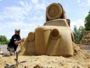 epa02194578 Sand sculptor Johannes Hogebrink from the Netherlands works on two skulls as part of a panoramic sand sculpture about pirate Klaus Stoertebeker at the hotel complex Jasmar Resort Ruegen in Neddesitz, Germany, 09 June 2010. International sand sculptors are working on a gigantic pirate panorama on the island of R?gen with more than 8,000 tonnes of sand. The exhibition opens on 13 Juneis the biggest sand sculpture show in Europe according to the organizers. EPA/Stefan Sauer