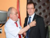 Ziyaretin sonunda Muhtarlar Derneği Başkanı Sabahattin Çolak, Pekdemir'e Türkiye Muhtarlar Derneği'nin rozetini taktı.