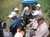 sandalyelere otururken, korumalar ise traktör kabininde yol aldı. İlginç görüntülerin yaşandığı kısa süreli yolculuk sonrasında traktörden inen heyet bölgeyi gezdi.