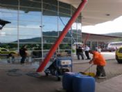Firma yetkilisi Emre Tekin ise , " Makinemizi Almanya ' dan getirdik saf su ile dış cepheleri temizliyoruz . Özellikle cam dış yüzeylerde alemim yum kaplamalarda granit taşlarda çok etkili temizlik yapabilen bir makinemiz var . Bu makinemizde saf su kullanıyoruz . Kirlerin gitmediği yerde ilaç kullanımı yapıyoruz . Saf su kullandığımız için camlarda hiçbir şekilde iz kalmıyor . Belediyemizin bizde isteği ile yeni terminalde su ile şu an temizlik işlemlerimizi sürdürüyoruz " diye konuştu .