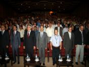 Konferansta öğrencilerin katılımının yoğun olduğu gözlenirken yer bulamayan öğrenciler salon merdivenlerine oturmak zorunda kaldı.