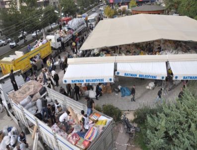 Batman’da belediye önünde kurulan yardım merkezinde toplanan ihtiyaç malzemeleri deprem bölgesine ulaştırılmaya devam ediyor.