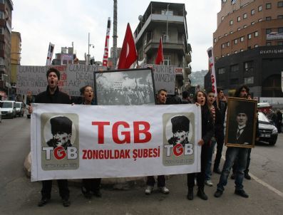 Zonguldak Madenci Anıt`ı önünde toplanan kalabalık sloganlar eşliğinde Valilik önüne kadar yürüyüş yaptı. Zonguldak Valiliği önünde basın açıklaması yapan TGB Zonguldak İl Başkanı Tolga Toy, “Bir 29 Ekim daha geldi, 88 kez. Fakat bu yıl biraz farklı, aslında her geçen yıl biraz daha hırpalanarak geliyor. 88 yılın sonunda Van`a çadır gönderemeyen bir cumhuriyetle karşı karşıyayız. 63 tane öğretmenini güvenli bir barınma olanağını sağlayamadığı için mezara koyan bir cumhuriyetimiz var artık. Bu cumhuriyetimiz artık Mustafa Kemal`in kimsesizlerin kimsesi olan cumhuriyet değil. Halkçı, devletçi cumhuriyet değil. Bu cumhuriyet nam-ı diğer 2. cumhuriyet. Bu ülkenin gençliği var. Her şeye rağmen ayakta. Bazen eğitim aşkıyla yanıp tutuşan Çalıkuşu Ferideler olarak Van`da göçük altında, bazen ülkenin namusunu beklerken bomba altında bazen `özerk eğitim, bağımsız Türkiye` sloganları atarak meydanlarda. Gençlik var, canlı ve Mustafa kemal`in cumhuriyetini yeniden kurmak için görev başında” dedi.Basın açıklamasının ardından yürüyüş sona erdi.