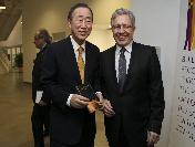 Birleşmiş Milletler Eğitim, Bilim ve Kültür Kurumu‘nun (UNESCO) iyi niyet elçilerinden Zülfü Livaneli(sağda), UNESCO tarafından ‘Kültürler arası Yakınlaşma Yılı‘ ile ‘Barış Kültürü On Yılı‘nın sona ermesi sebebiyle New York‘ta düzenlenen Yüksek Panel‘e katıldı. Livaneli Kore diline çevrilen Osmanlı tarihi ile ilgili ‘Engereğin Gözü‘ romanını BM Genel Sekreteri Ban Ki-moon‘a (solda) hediye etti.