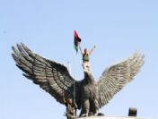 Tugay`ın girişinin üzerinde yer alan Kaddafi`nin sembollerinden kartal heykeli de muhaliflerin oyuncağı oldu. Heykel üzerine tırmanan muhalif askerler, zaferi havaya ateş açarak kutladı.