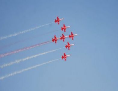 Türk Hava Kuvvetleri Akrobasi Timi "Türk Yıldızları" gösteri öncesinde ilk olarak vatandaşları selamlama uçuşu gerçekleştirdi. Dünyaca üne sahip olan ‘Türk Yıldızları’ dünyada sekiz süpersonik uçakla gösteri yapan tek takım olarak gösteriliyor. Saatte yaklaşık 900 ile bin 200 kilometre hızla hareket eden Türk Yıldızları, seyir ve estetiği bir arada sunarak adrenalini yükselten hareketlerle Gazianteplilere büyük coşku ve unutulmaz bir gün yaşattı. Birbirinden şık akrobasi hareketlerle adeta nefes kesen yıldızlar, şehitlerimiz için de gökyüzüne kalp çizdi. Yoğun ilgiyle karşılaşan gösteride özellikle çocukların meraklı bakışları dikkatlerden kaçmadı. Gösterileri ilgiyle izlediklerini söyleyen çocuklar, gösterilerde gerçekleştirilen akrobasi hareketlerinin muhteşem olduğunu ifade etti.
