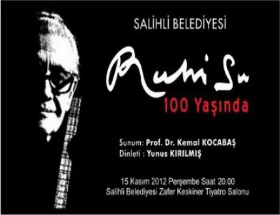 Salihli Belediyesi’nin düzenlediği "RUHİ SU 100 Yaşında" etkinliği'nin, 15 Kasım 2012 Perşembe günü saat 20.00'de Zafer Keskiner Tiyatro Salonu’nda yapılacağı açıklandı.