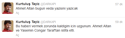 Haberi, Taraf Gazetesi Yazı İşleri Müdürü Kurtuluş Tayiz sosyal paylaşım sitesi Twitter'daki hesabından duyurdu.