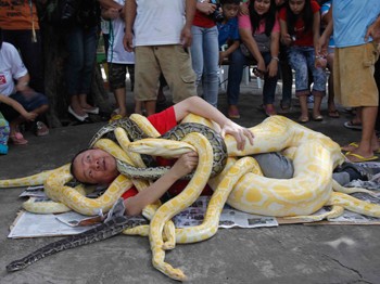 Güney Asya'ya özgü olan Birminya pitonlarının vücudunu tamamen kaplayan adam, kendisini görüntüleyen turistlere de bol bol poz vermeyi ihmal etmiyor. 5 metreden fazla büyüyen Birminya pitonlarının koyun, timsah hatta insan bile yedikleri biliniyor.