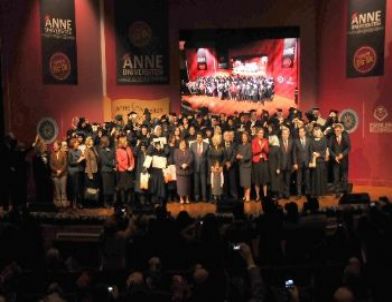 Yıldız Teknik Üniversitesi Davutpaşa Kampüsü’nde gerçekleştirilen törende, mezun anneler son derslerini Emine Erdoğan’ın katılımıyla birlikte dinledi. 9 ayrı dersten 48 saat eğitim gören anneler 8 hafta boyunca uzman akademisyenler tarafından eğitim aldı. Diplomalarını Emine Erdoğan’ın elinden alan 61 mezun, sahneye çıkarak keplerini havaya attı.Törende konuşan Emine Erdoğan, “Ülkemizde bir 10 yıl öncesine kadar kadınların doğum sırasında ölümü ve bebek ölüm sayısı fazlayken bugün bu oran artık çok aza indi. Bunların hepsi eğitimle oldu. Anneler tecrübe ve eğitimi birleştirerek daha da kültürlü oldular. Gece gündüz çabalayarak emek harcayıp çocuklarını eğittiler. Hepimiz için aydınlık bir nesil inşa ediyorlar. Anneler daha fazla donanım sahibi olmalılar. Üniversitedeki bu eğitim de, katılan anneler için çok yararlı olacaktır.” dedi.
