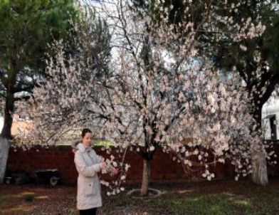 Bahçesindeki ağacın çiçek açmasının şaşkınlığını yaşadığını beliten Salih Pamukçu, 'Kış ortasında böyle bir manzaranın oluşması gerçekten ilginç ' dedi.