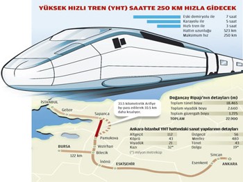Devlet Demiryolları, Ankara-İstanbul yüksek hızlı tren projesinde değişikliğe gidiyor. 2013 sonuna yetiştirilmesi hedeflenen projedeki değişiklikle, Ankara-İstanbul arası seyahat süresi 10 dakika kısalarak 3 saate, hattın uzunluğu da 533 kilometreden 523'e inecek.