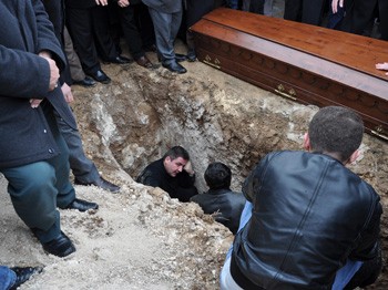 Önceki gün aracında ölü bulunan emekli Emniyet Müdürü Hasan Eryılmaz toprağa verildi. Emekli müdürün ağabeyi evinin bahçesinden getirdiği toprağı mezarın üzerine attı.