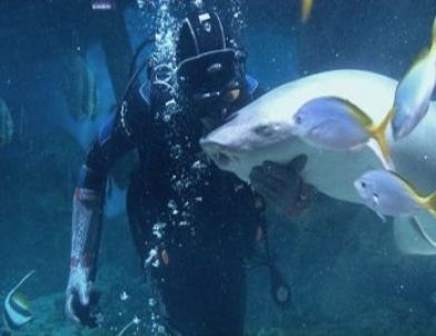 Rusya’da su hayvanları eğitmeninin dev okyanus akvaryumunda köpek balığıyla dansı yürekleri ağızlara getirdi.