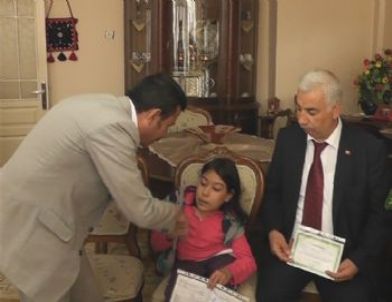 Doğuştan omurilik rahatsızlığı nedeniyle evinde eğitim alan 12 yaşındaki Pınar İnce'ye karne ve teşekkür belgesi evinde verildi.