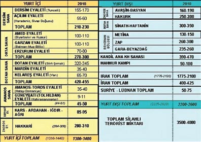 PKK, Türkiye sınırlarında sözde 7 ayrı saha oluşturdu. İstihbarat raporlarına göre bu sahalarda sayıları bin 300 ila bin 400 arası teröristin bulunuyor. Ağırlıklı olarak 'Botan ve Zagros Eyaleti' diye tanımladıkları Hakkari, Siirt, Şırnak kırsalında yaklaşık 600 PKK'lı var. Yurt dışında ise 2 bin 500 civarı örgüt mensubu var. Rapora göre toplamda PKK'nın yaklaşık 4 bin adamı bulunuyor.