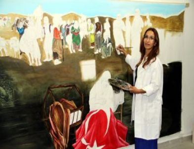 Kurtuluş Savaşı mücadelesinin figürlerini tuval üzerine yaptığı yağlı boya ile anlatan resim öğretmeni Selcan Kelezoğlu, Kurtuluş Savaşı’nın ülke için çok önemli olduğunu belirterek, “Çalışmam Kurtuluş Mücadelesi’ni anlatıyor. Yıkık, dökük harabe hale gelmiş bir evde annemiz bayrak dikiyor. Ocağımız var. Ocağımızın içinde sönmemiş alev olacak. Ocakların hala sönmediğini işaret ediyor. Yine soframız olacak. Soframızın üzerinde yarım ekmek olacak. Bu da evimizdeki yarım ekmeğin yarısının cephaneye gönderildiğini anlatıyor. Yukarıda ise, katarlar halinde halk yaşlı, kadın, çocuk demeden Kurtuluş Savaşı'na emek vermiş. Bu şekilde vatanı kurtarmışız. Bunu anlatıyoruz. Çalışmamızda tuval üzerine yağlı boya kullanıyoruz. Bu tür çalışmaların normalde çizimi ve boyanması 6 ay ve bir yıl gibi bir sürede biter. Fakat iki haftadır çalışıyorum, önümüzdeki hafta içerisinde bitirmeyi planlıyorum” dedi.