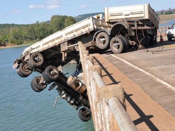 Brezilya'da bir şoförün direksiyon hâkimiyetini kaybetmesi sonucu kullandığı kamyon köprüde asılı kaldı.