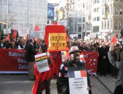 Saadet Partisi tarafından organize edilen eylemde, Fransa'nın İstanbul Başkonsolosluğu'na temsili altınlar ve koltuk ile yürüyen grup, siyah çelenk bıraktı. Göstericiler adına yapılan basın açıklamasında Fransa'nın Mali'de bulunma sebebinin Afrika'daki güç kaybı olduğu ve ülkedeki zengin yeraltı kaynaklarına sahip olma isteğinin yattığı ifade edildi.Mali'de, geçen aylarda iki ayrı darbe girişimi yaşanmış ve bu girişimlerin ardından ülkede siyasi kaos ortamı oluşmuştu. Ülkenin kuzeyindeki bazı gruplar kendi bölgelerinde merkezi otoritenin dışında hareket etmeye başladığı gerekçe gösterilerek Fransız askeri ülkeye gönderilmişti. Bu süreçte Mali'ye komşu ülkeler de bu girişimi desteklediklerini duyurmuştu. Bölgedeki Fransız varlığı ise çeşitli kuruluş ve ortamlarda Müslümanların tepkisine neden oldu. Saadet Partisi tarafından Beyoğlu'nda düzenlenen protesto gösterisi de Fransa'nın bölgedeki varlığına tepki içerikli gerçekleşti. Parti üyesi bir grup, İstiklal Caddesi'ndeki Galatasaray Lisesi önünde bir araya geldi. Fransa'nın bu ülkede bulunma sebebini 'yeraltı zenginliklerine hakim olma ve güç mücadelesi' olarak gören protestocular, yüzlerini siyaha boyayarak, kartondan yapılmış külçe altın maketleri taşıdı. 'Misyonerler başaramadı, silahları da başaramayacak', 'Yaşasın mazlumların dayanışması', 'Mazlumlar ayağa kalkamadıkça zalimler diz çökmez' yazılı pankartlar açan göstericiler, 'Katil Fransa Afrika'dan defol', 'Biz Kanuni'nin nesliyiz', 'NATO'ya hayır hemen şimdi D8' şeklinde sloganlar attı. Grup, İstiklal Caddesi boyunca yürüyerek Fransa Başkonsolosluğu önüne geldi. Polis, konsolosluk önünde güvenlik önlemi alarak göstericileri binaya yaklaştırmadı. Fransa'nın, ülkedeki sömürü yönetimini anlatan temsili koltuk ve üzerinde oturan gösterici, protestocular tarafından ıslıklandı. Basın açıklamasını okuyan Saadet Partisi İstanbul İl Başkanı Selman Esmerer, Mali'nin yıllardan beri sömürü düzeni altında bulunduğunu belirterek ülkede ilk üniversitenin kuruluşunun bile ancak 2000 yılında gerçekleştirildiğini söyledi.