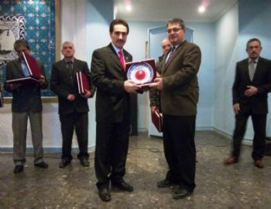 Müdür Koca, emekmliye ayrılan personellere birer şilt takdim etti .