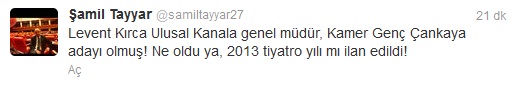 İşte üst üste gelen bu dikkat çekici haberlere AK Parti Gaziantep milletvekili Şamil Tayyar'dan espirili bir eleştiri geldi. Sosyal paylaşım sitesi Twitter'dan bu iki gelişmeyi değerlendiren Tayyar, 'Levent Kırca Ulusal Kanala genel müdür, Kamer Genç Çankaya adayı olmuş! Ne oldu ya, 2013 tiyatro yılı mı ilan edildi' dedi.