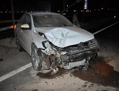 Aksaray’da direksiyon hakimiyetini kaybeden sürücü refüjdeki aydınlatma direğine çarptı.