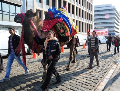 Basın açıklamasının ardından platform üyeleri, Karabağlar’dan getirilen iki deveye binerek, ‘Deve inadın tutsun’, ‘senelerin işçisi bitsin artık çilesi’ sloganları eşliğinde Gündoğdu Meydanı’na doğru yürüyüşe geçti.