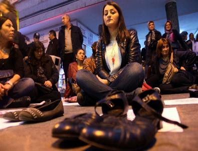 Gazi (Mecidiye) Caddesi, Konak Sineması önünde Kadına Yönelik Şiddete Karşı Mücadele Günü'nde bir araya gelen çok sayıda kadın, oturma eylemi yaptı. Şiddete uğrayan kadınların yaşadığı olayların yazdığı dövizleri yere seren ve üstüne de kadın ayakkabısını koyan bir grup kadın, bir süre oturma eylemi yaptıktan sonra dağıldı