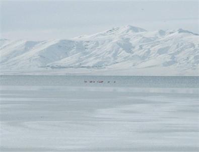 Van'da havaların ısınmasıyla birlikte Erçek Gölü havzasına gelen flamingolar, kar yağmasına rağmen bazılarının gitmediği görülüyor.
