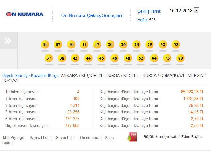 Milli Piyango İdaresi Genel Müdürlüğünce düzenlenen 'On Numara' isimli şans oyununun bu haftaki(16 Aralık 2013) çekilişi yapıldı. 593. Hafta 16 Aralık On Numara ikramiye kazanan şanslı numaralar belli oldu.