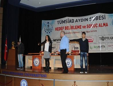 TÜMSİAD Aydın Şubesi’nin desteğiyle düzenlenen ve eğitimci yazar Oğuz Saygın’ın konuşmacı olarak katıldığı programlarda katılımcılar sıra dışı anlar yaşandı. Oğuz Saygın’ın Aydın’da katıldığı ilk program Adnan Menderes Üniversitesi Atatürk Kongre Merkezi’nde gündüz gerçekleşti. Oğuz Saygın katılımcılara “Hedef Belirleme ve Sonuç Alma” konulu interaktif bir konferans verdi. Düzenlediği sıra dışı interaktif etkinlerle tanınan Oğuz Saygın, 600’ün üzerindeki dinleyici kitlesine neşeli ama akılda kalıcı bir sunum yaptı. Eğlenceli bir eğitim anlayışının benimsendiği konferans, bu konuda amacına ulaştığını gösterdi.