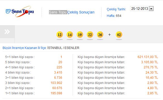 25 Aralık 2013 Şans Topu Sonuçları; 12 14 19 22 26 + 02 olarak belirlendi.
