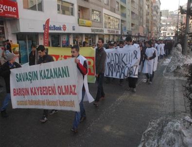 Hakkari Üniversitesi Cölemerg Öğrenci Derneği (CÖDER) üyeleri, Roboski olayının aydınlanması için kefen giyip yürüyüş yaptılar.