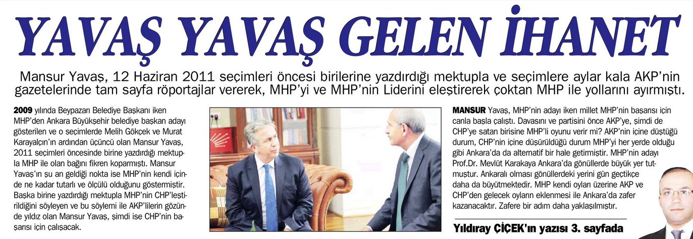 MHP'nin gazetesi Ortadoğu, sürmanşetten yayımladığı Yılıray Çiçek imzalı hayli uzun bir yazı ile Mansur Yavaş'ı hedef aldı. Mansur Yavaş'ın, ayrılık sinyallerini 2011 yılından bu yana verdiği belirtilen yazının başlığı da hayli ilgi çekici: 'Yavaş yavaş gelen ihanet'