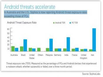 'Sophos ' tarafından yayınlanan 'The 2013 Security Threat Report 'a göre, yıllardır aramızda bulunan zararlı yazılımlar, Amerika'da bulunan PC'lere göre, Andorid işletim sistemleri üzerinde yüzde on oranında daha sık rastlanır olmuş durumda. Raporda, özellikle 2012'nin Son üç ayında gözle görülür bir artış olduğu söyleniyor. Aynı süre diliminde PC platformu için artan yüzde sekizlik zararlı yazılım saldırılarına kıyasla, Android platformunda gözlemlenen rakam yüzde on olarak hesaplandı.