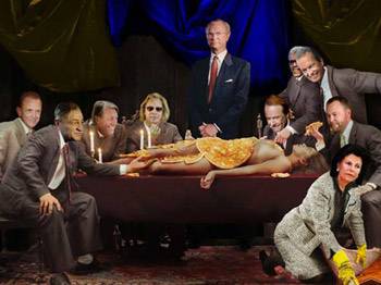 İsveç Kraliçesi Silvia ve eşi Kral Harald, arkadaşları ile bir masa üzerinde yatan çıplak modelin üzerindeki pizzayı yerken...